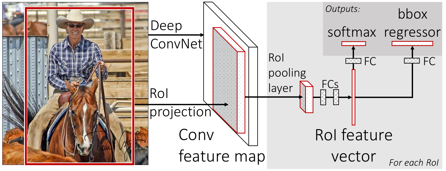 $[u\geq 1]$ 表示爱佛森括号,意思是,当 $u\geq 1$ 时,$[u\geq 1] = 1$,否则 $[u\geq 1] = 0$;$u=0$时,表示当前是背景,背景是没有边界框的,也就没有边界框回归损失这一项。$\lambda$ 是权重。好滴,Fast R-CNN 记录完毕。Faster RCNN 就相对简单点了,只是在 Fast R-CNN 的基础上使用 RPN 替换了 SS 算法。