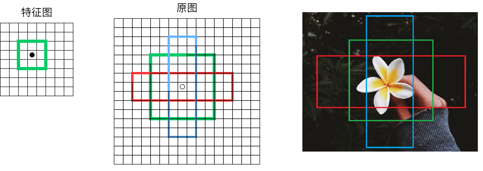 首先在特征图上进行卷积的时候,计算当前卷积窗口中心点对应原图哪个点,然后以原图为中心,生成 $k$ 个 anchor box,anchor box 是提前给定的大小和长宽比例。如下图所示,从特征图一步步映射到原图。anchor box 里可能有目标,也可能没有目标。其中,每个 anchor 的形状不一样,因为目标大小不一样,长宽比也不一样。