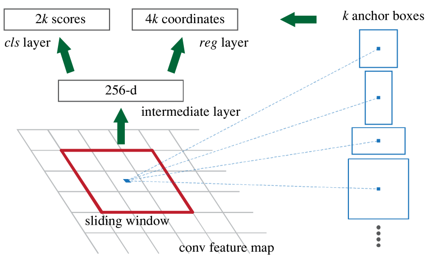 前面讲过,每个 anchor 会生成 2 个概率分数和 4 个预测框参数。如对于概率分数,[0.3, 0.7] 表示有 0.3 的概率是背景,0.7 的概率是前景。对于同一目标,有 $k$ 个 anchor,就会有 $2k$ 个概率分数和 $4k$ 个边界框参数。而 anchor 的大小和比例是提前设置的,如 $128\times 128,256\times 256,512\times 512$ 大小,对应 anchor 的面积;比例一般是三种,1:1, 1:2, 2:1,对应 anchor 的长宽比。因此,每个位置,也就是每个滑动窗口,都有 9 个 anchor。