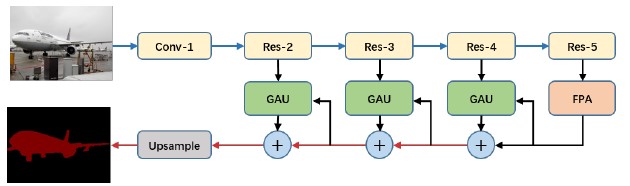 细节的话,global pooling 是通过 avgpool 实现的,将图像上采样到 1X1 大小。FPA 中的上采样是通过转置卷积实现的。