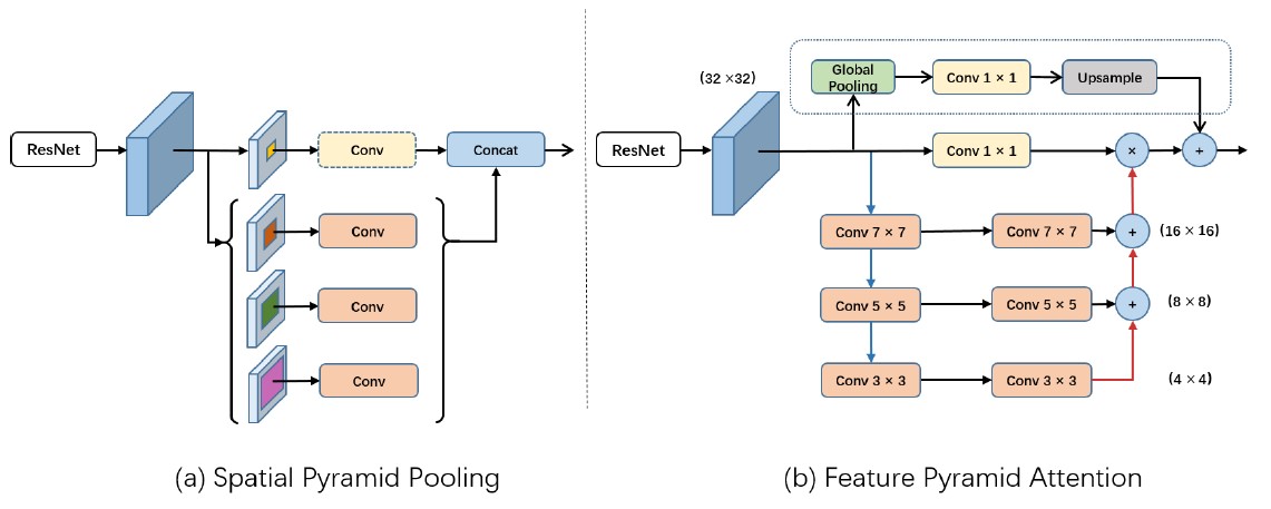 - 与 SPP 不同,使用了 FPA(Feature Pyramid Attention)结构进行多尺度特征融合。全尺寸特征图的 global pooling 和卷积可以理解为注意力机制,将全局上下文信息作为先验知识引融入到通道的重要性中。