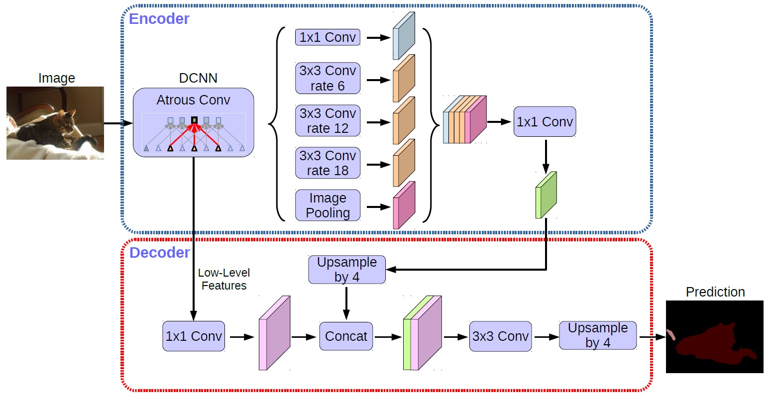 ASPP,总结一下就是,对特征图进行平均池化、卷积、标准化和激活,在经过 4 路并联的卷积层。对这五路输出进行concat拼接,经过1X1卷积降维后输出。相当于细化了特征提取的过程。 - 移除了条件随机场。