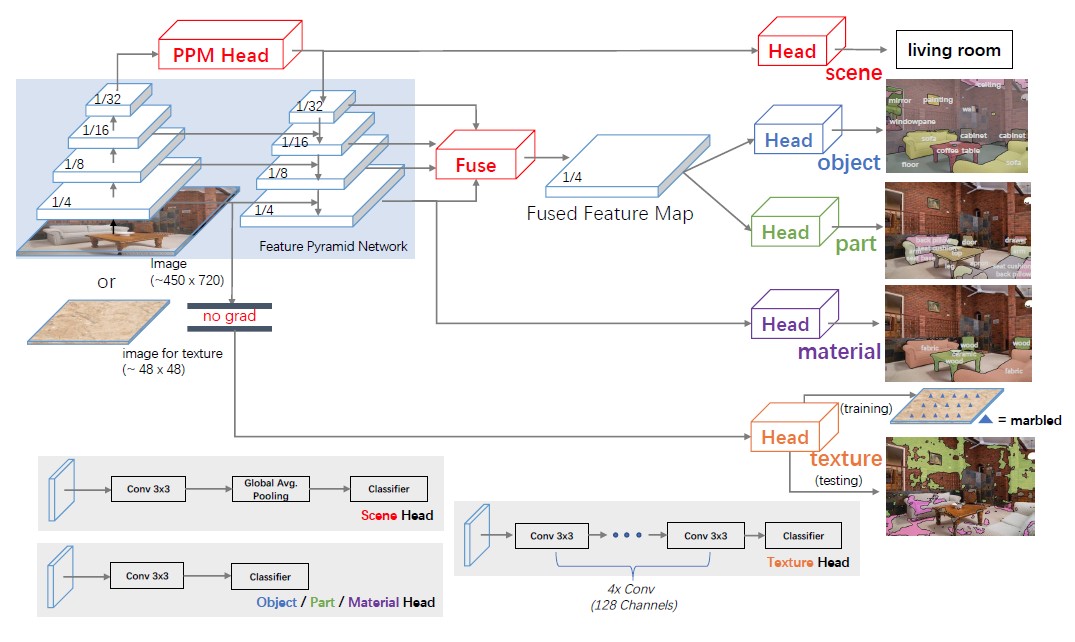 这是一种统一感知解析网络,看图说话就是:经过 backbone 和 FPN 提取到的特征图,可以应用到各种场景,目标检测、场景识别、材料识别或者文本生成等,而这当然也可以用到语义分割中。