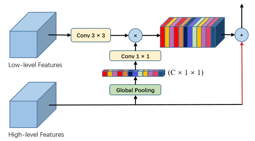 1X1大小,经过卷积层后和低维特征进行相乘。![]()