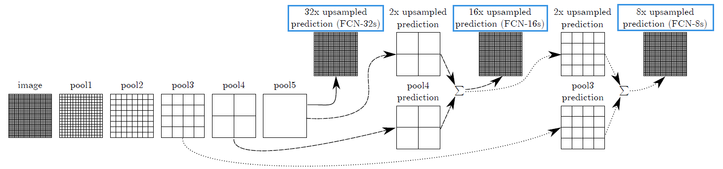 - 对于 FCN-8s,将 $F$ 与 pool3 后的结果相加,而后进行 8 倍上采样