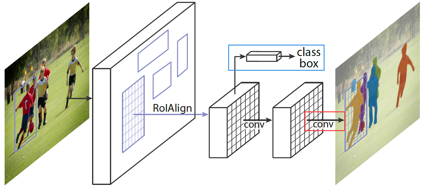 按着前文描述,网络结构如下,蓝色分支是 Faster R-CNN 中用于预测类别和回归框的分支,红色分支是新加入的预测掩码的分支。而且还可以增加其它分支完成新的任务,如关键点检测等。