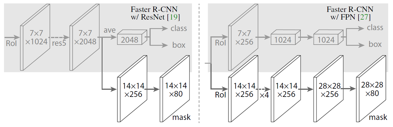 - 输入一副图片,将图片输入到特征提取层 backbone,也可以融合 FPN 机制,最终获得对应的 feature map。下图中,左图是 Mask R-CNN 和 Faster R-CNN 结合的方式,右图是 Mask R-CNN 和 FPN 结合的方式。需要注意的是,灰色部分为阴影,是目标检测的分支,roi-align 到