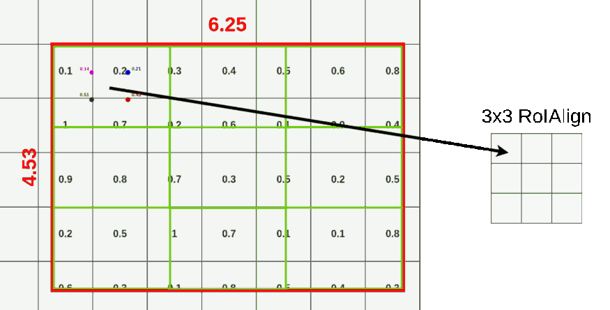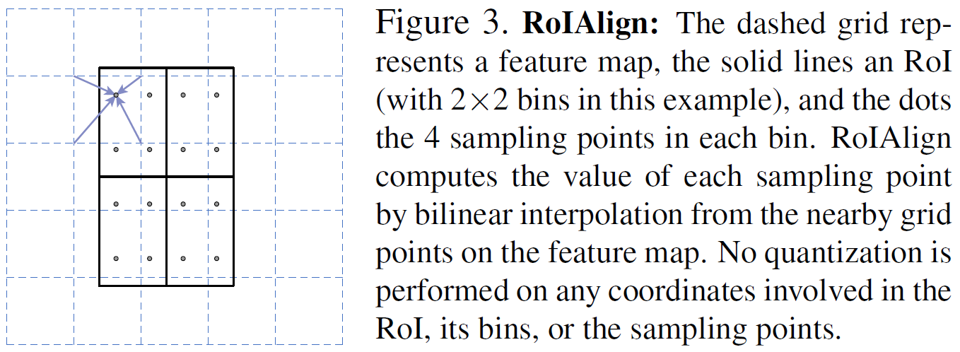 对于 ROI-Align 而言,不在对 ROI 边界进行取整。原图映射到特征图,坐标点可以是小数。在这之后,假设 pool 到 3X3 的格子,那么计算每个格子中心四个点的坐标。对于每个点而言,对每个周围最近的四个点进行采样,使用双线性插值计算当前点的取值,而后 max pool 获取当前格子里面的值。无论采样点的多少与采样方式,结果都不会很差。如下图,作者也只使用了这一张图介绍了 ROI-Align。