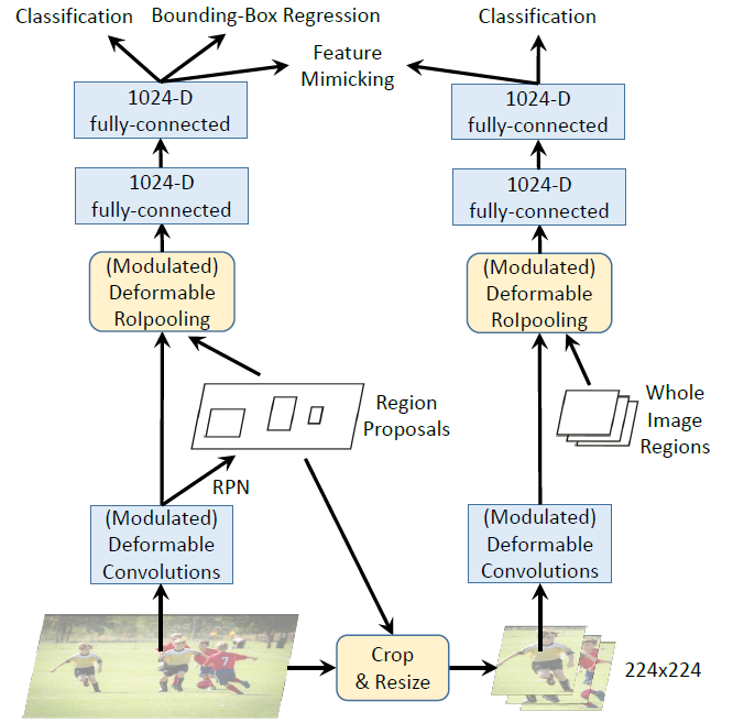 - 训练一个教师网络,类似判别器,用于指导检测网络的检测,文中称为特征模仿(feature mimicking),没读懂这个和前文改进的联系,唯一的相似点是摘要中指出的:提高模型捕获特征的能力,但我感觉这里是重点