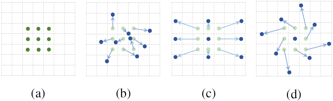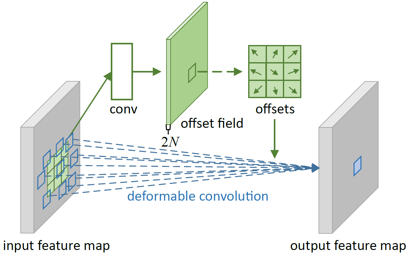 传统的 CNN 在建模时,几何变化能力受限,感受野都是规则的相邻矩形。于是,提出了可变形卷积,通过无监督的形式学习额外的偏移参数,加强模型的几何变换能力。也就是说,有了偏移参数,此时的卷积核读取的输入不再是规则的矩阵。且像传统 CNN 一样,支持端到端训练和反向传播,可以通过插拔的形式替换传统模型中的 CNN 。