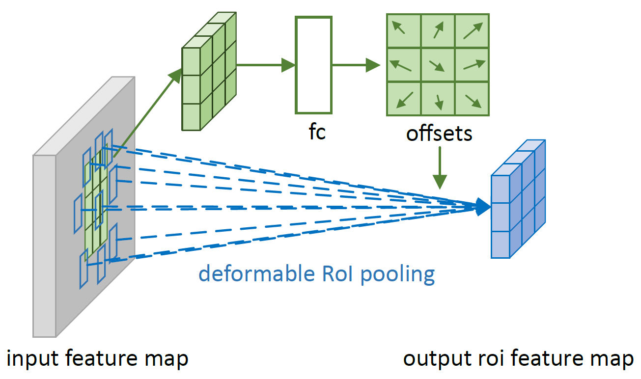 $bin$ 表示要被池化的区域,$n_{ij}$ 是对应区域中的像素点的数量。而此时,可以学习一个偏移量参数 $\Delta p_{ij}$,新的 ROI Pooling 公式就是