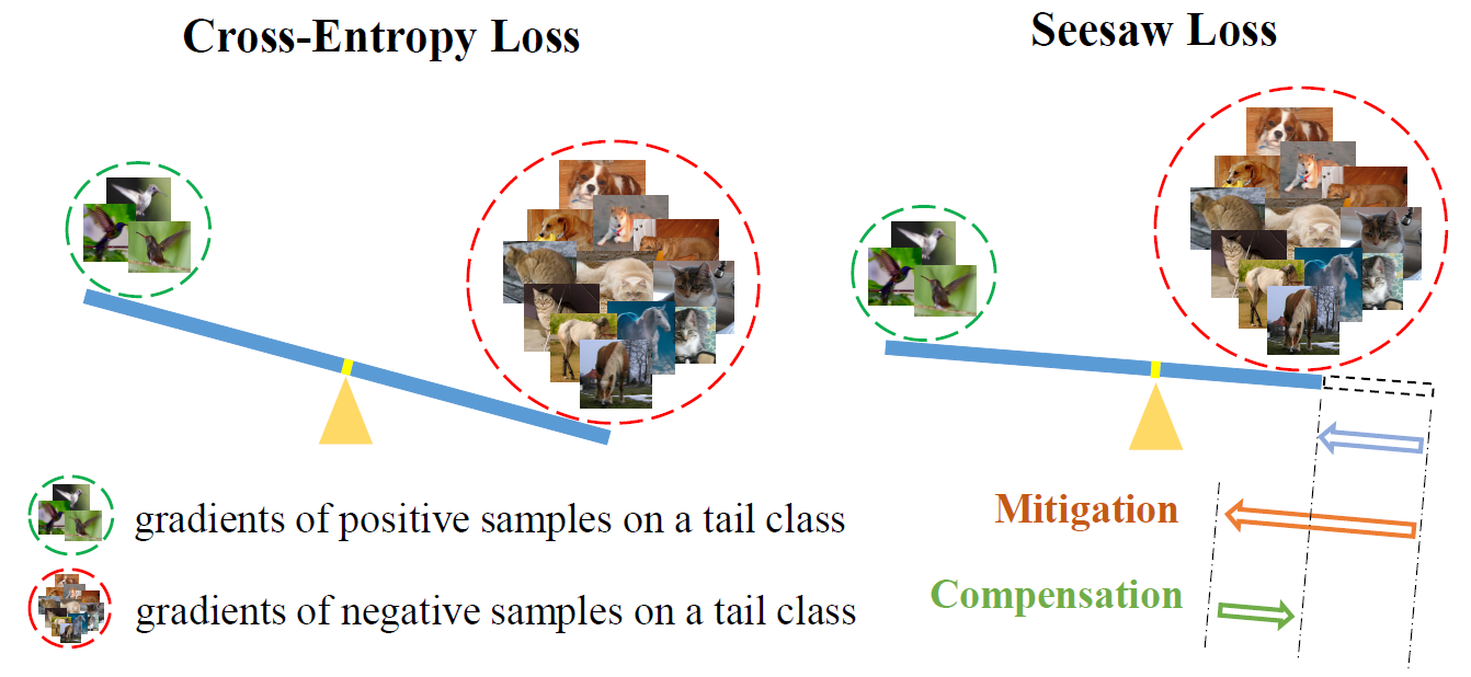 seesaw loss 在训练期间,会统计类别 $i$ 的数量为 $N_i$,对于正样本,也就是当前网络正在处理的类别 $i$,通过缓解因子调整对其它类别的惩罚,公式如下: