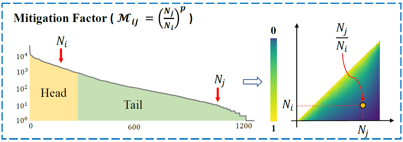 $S_{ij}$ 表示一种可调节的因子,表示类别为 $i$ 的正样本对类别 $j$ 的惩罚。其中,$M_{ij}$ 表示头部类别 $i$ 降低对尾部类别 $j$ 的惩罚,$C_{ij}$ 表示增加对类别 $j$ 的惩罚,当类别 $i$ 被误分类为 $j$ 时。
