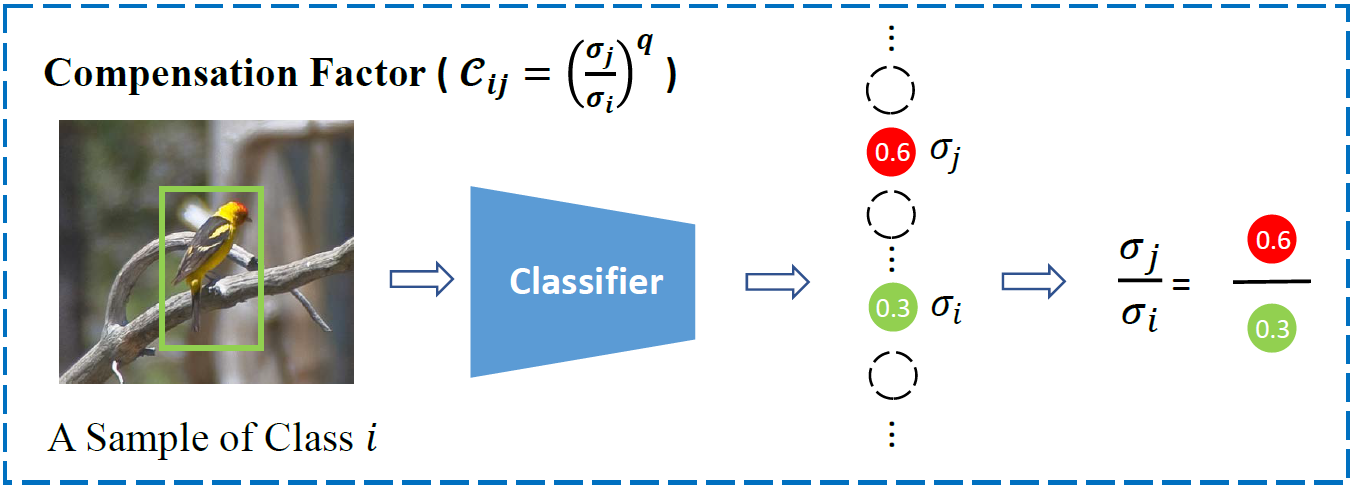 - 但是只减轻惩罚是不够的,因为其他类别的样本在被误分类为尾类时,尾部类别受到的惩罚仍然较小。说人话的意思是,类别 $j$ 相关的神经元受到的惩罚小,神经网络为了最小化损失,所以不管输入的是什么类,有可能直接输出第 $j$ 类,所以盲目地降低负样本的梯度会增加导致尾类假阳性的风险。所以增加 $C_{ij}$ 增加对错分类实例的惩罚,避免假阳性的出现,算是一种补偿机制。