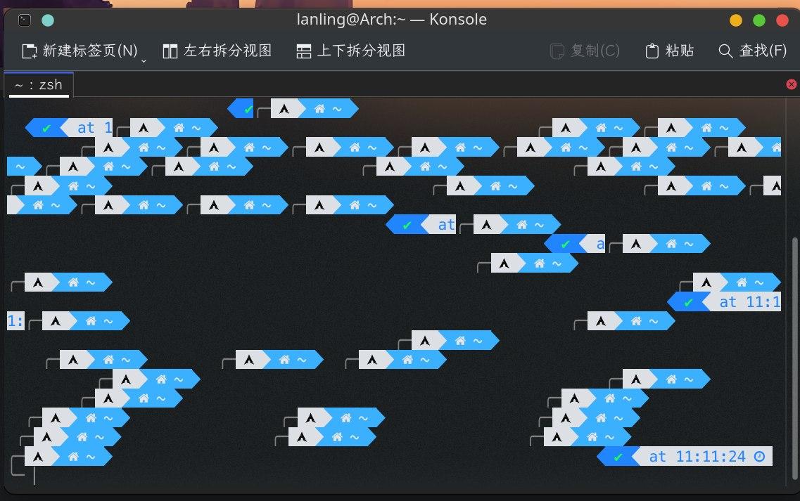 sudo chsh -s /usr/bin/bash,如果切换失败,可以尝试进入root切换或usermod -s /usr/bin/fish lanling命令,查看系统默认终端:cat /etc/shells; shell用的是fish毕竟是真的舒服,oh my zsh太乱了。系统自带的konsole配和oh my zsh时常乱码,但是,不可否认,konsole分屏、配色、标签页等各个方面都极度强大。