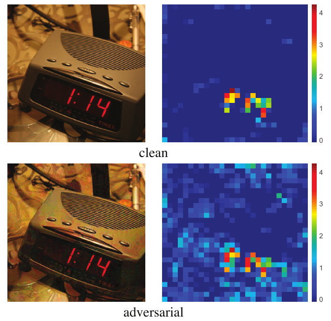 来自论文 Feature denoising for improving adversarial robustness, CVPR 2019。如下图所示,论文注意到了对抗样本在模型高层的巨大差异信息,所以,选择了在模型的高层对数据进行去噪,而不是输入层。