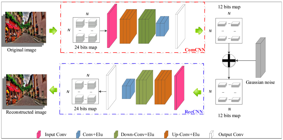 - 损失函数,对于编码器,使用更多的 0 来编码图像,因此损失为 $\lambda \Vert Com(\theta_1, x) \Vert^2$,使其尽可能的小;对于解码器要尽可能的重构原始图像,因此损失为 $\Vert Rec(\theta_2, Com(\theta_1, x)+\phi) -x \Vert^2$,$\phi$ 是高斯噪音。最终的损失是两者相加,两个模型的参数是同时训练和更新的。但是我在复现的时候,发现 $\lambda = 0.0001$,也能猜出这篇论文的大概效果。