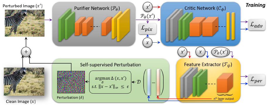 - 在训练阶段,设计两个损失,第一个损失是目标模型的分类损失,第二个损失是子监督扰动的损失,企图网络能够去除自监督扰动,以此抵御对抗样本的攻击。