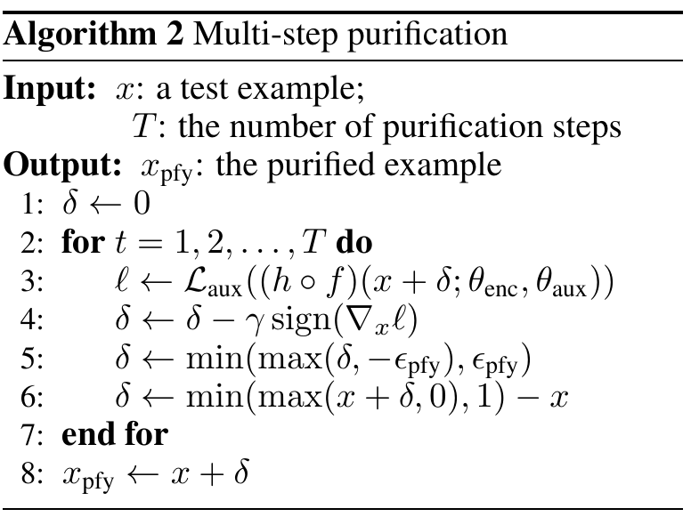 来自论文 Online Adversarial Purification based on Self-Supervision, ICLR 2021。这篇论文在模型、算法还是有一定创新度的,也是我重点复现的论文之一。不过这篇论文虽然有对抗样本提纯的概念,但严格意义来说,属于对抗训练的论文,应为这个算法会修改目标模型的参数。