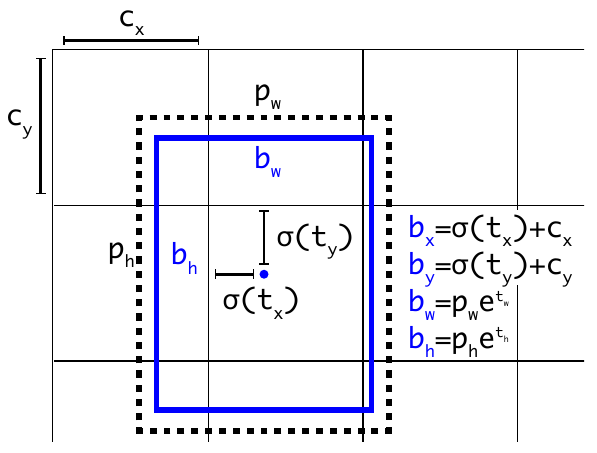 由于 $t_x,t_y$ 的输出值不受限制,$(x,y)$ 能忽略 Anchor Box 的存在而而满天飞。所以网络增加了 sigmoid 函数限制 $t_x,t_y$ 的取值在 0 到 1 之间。具体一点,就是更改网络的输出为 $(t_x, t_y, t_w, t_h, t_o)$。由于 YOLO 的预测的尺寸、中心点的坐标都是相对图片的占比,比如一个目标位于图片的正中心,那么 $(x,y)=(0.5,0.5)$ 。如果当前格子相对图片的偏移是 $(c_x,c_y)$,Anchor Box 之前的宽和高是 $(p_w,p_h)$,那么预测的 bounding box 输出为:
