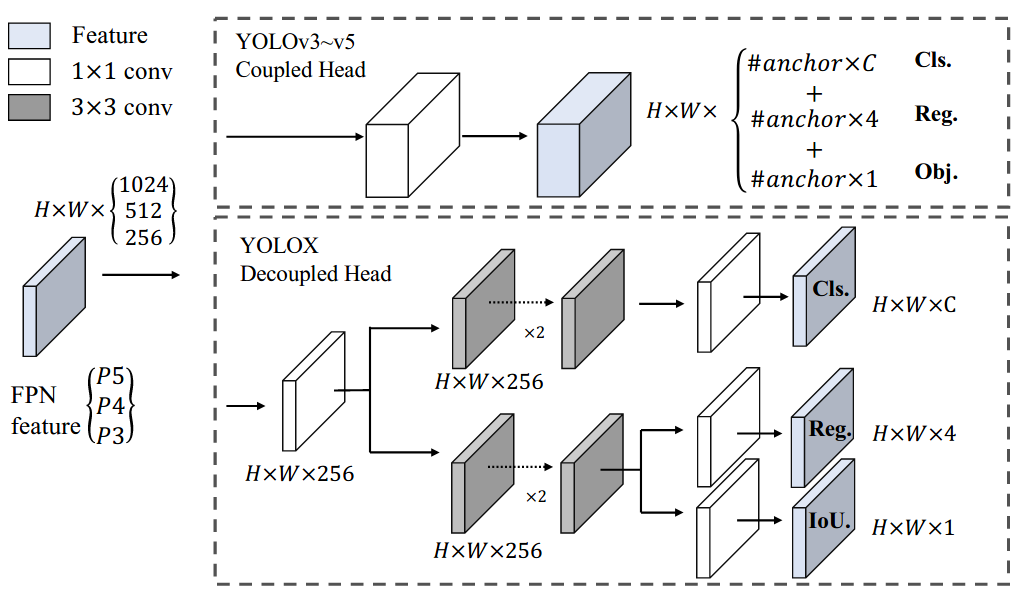 因为 neck 有三组输出,所以 head 对 neck 的每一组输出都要进行处理。对每一个输入经过不同的 stem 把通道数降维到 256,而后接入解耦的任务分支,包括分类(cls)、位置框(reg)和前背景(obj)三个网络。