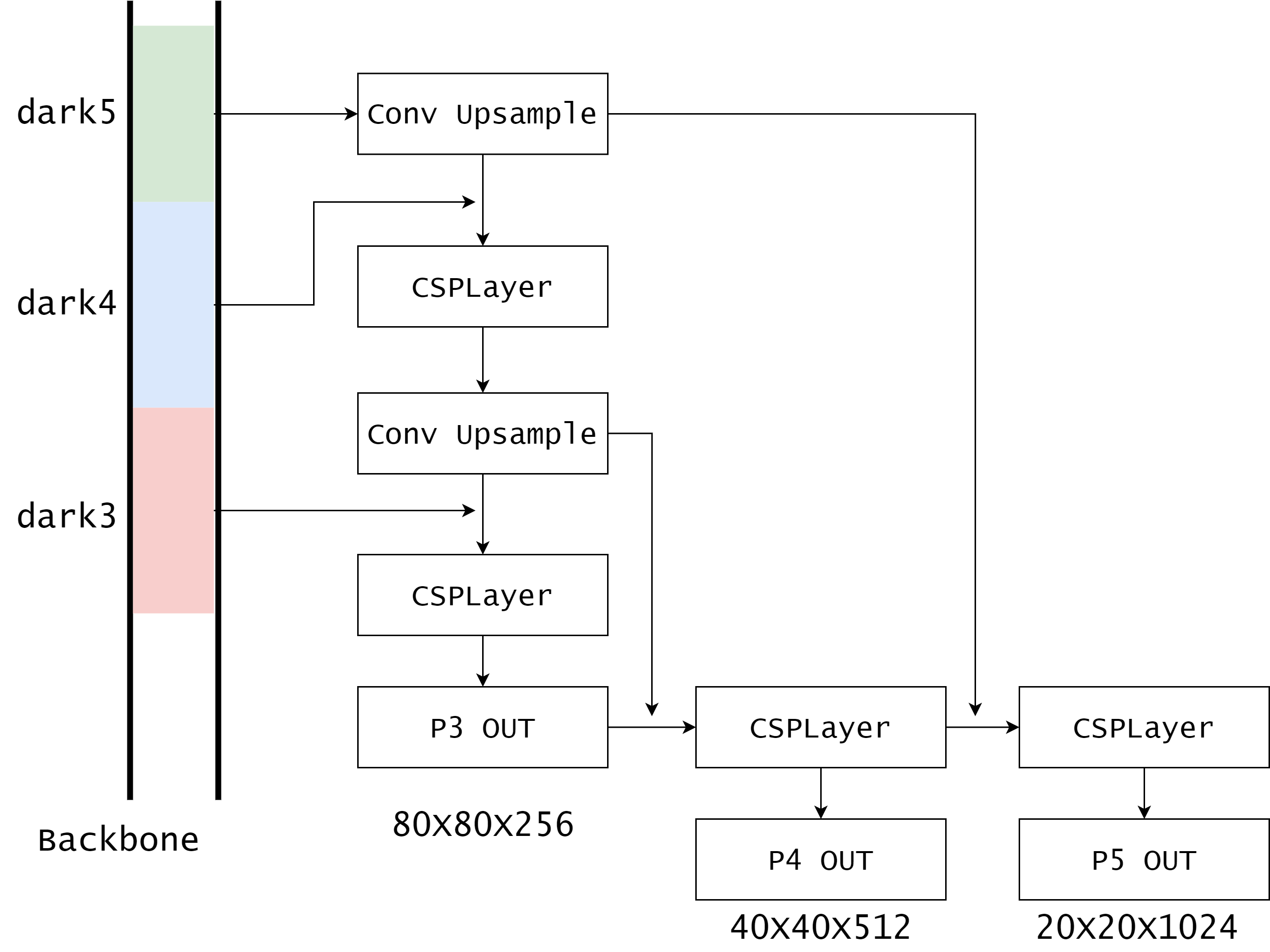 获取 backbone 的 dark3, dark4, dark5 的输出作为输入。这里用文字描述的话太复杂了,简单的画图展示一下大概结构,精细的结构还是要看源代码: