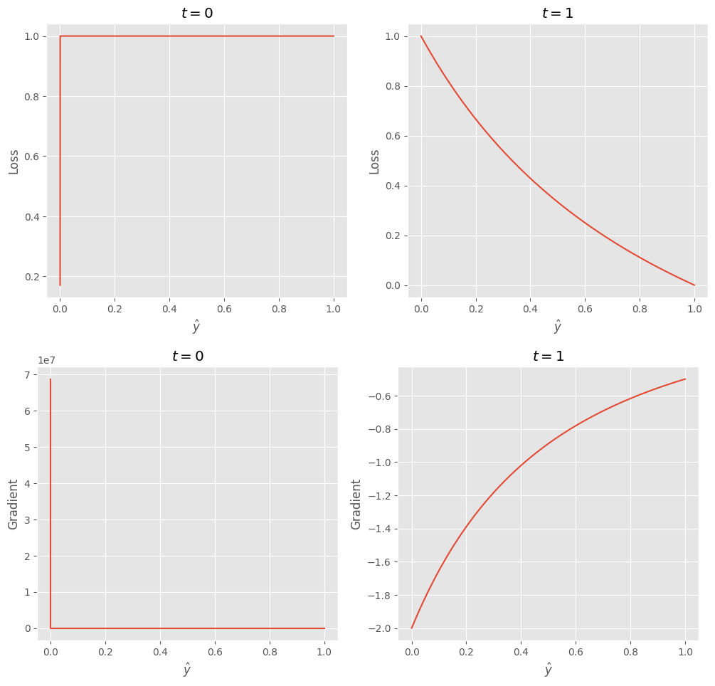 这也就解释了为什么 dice 训练损失不稳定的原因,当 $t=0$ 的时候,虽然损失很大,但更新网络时对应的梯度为 0。损失值不稳定还可以理解,但是如果 $\hat{y}$ 预测结果也很小时,梯度会飞升。那为什么推荐和 CE 一起使用呢?看上图就可以知道,$t=0$ 的部分没有梯度。那为什么还是结果十分不好呢?继续往下看。